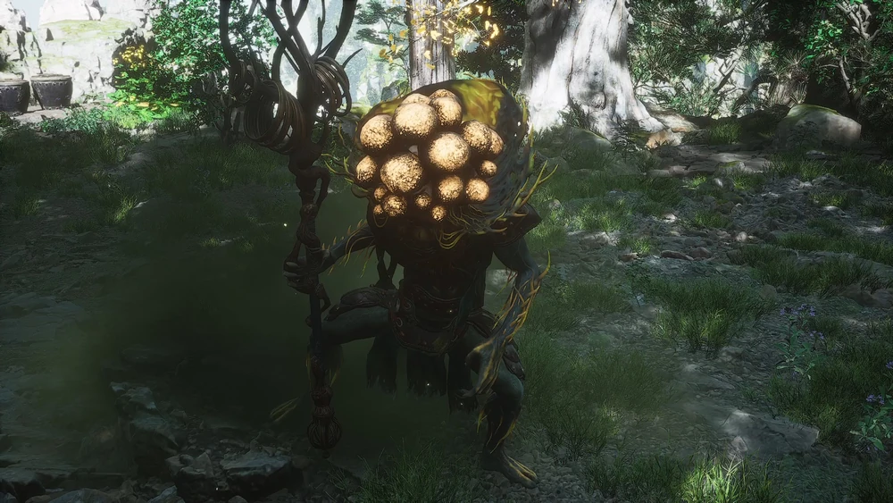 Atop the mist-shrouded ridges of Yellow Flower Temple, where silk threads whisper through crumbling halls, a cluster of Monkey-Head Fungi lures the traveler. Pluck the heart of the bunch by the forsaken shack, and the soil betrays its ruse: Fungiwoman bursts forth, her head a grotesque bouquet of toxic caps, body ethereal as she soars on spore-choked gales.